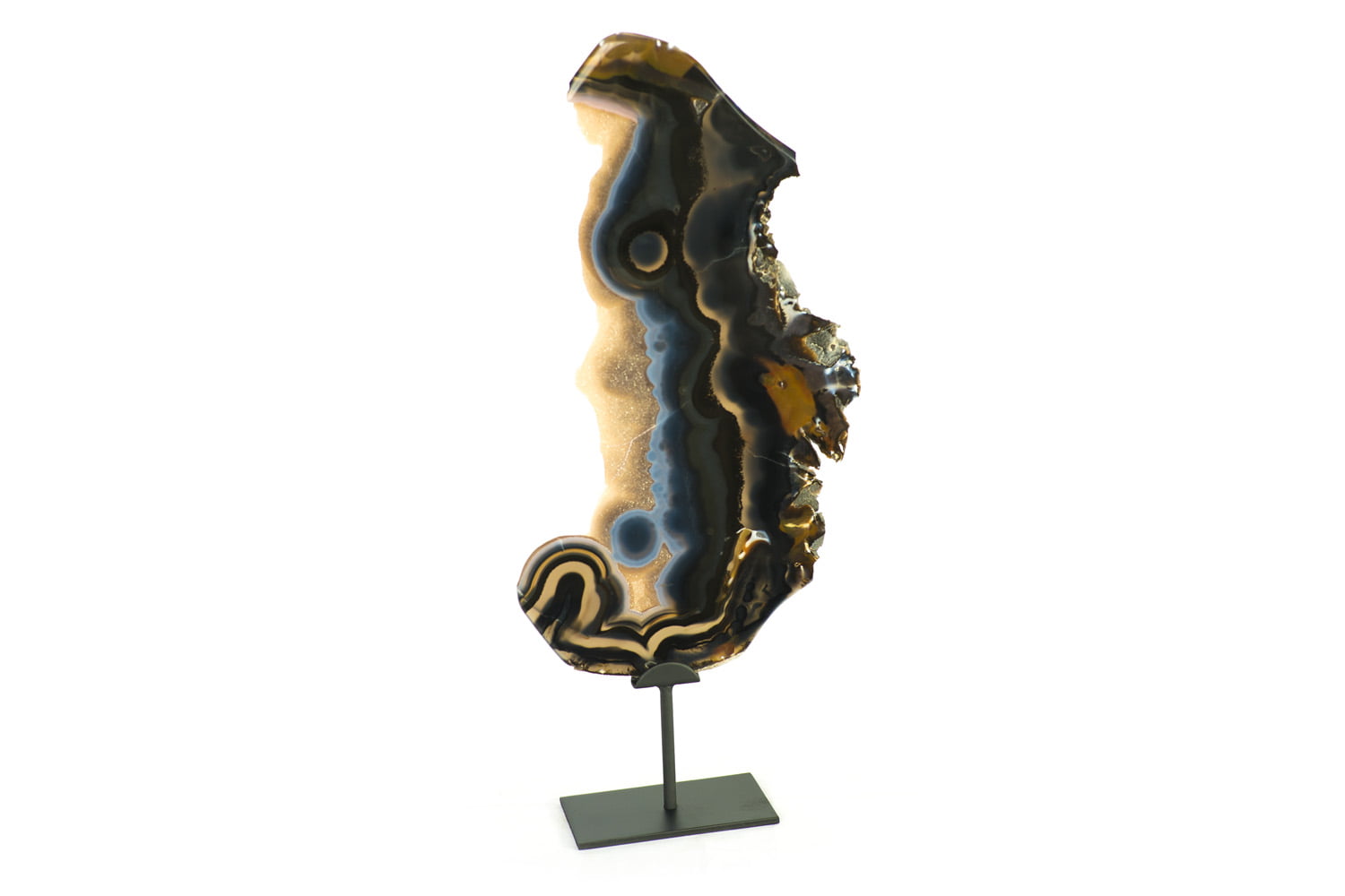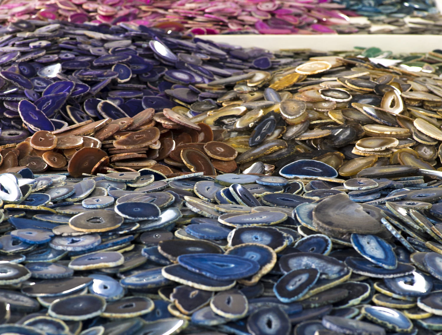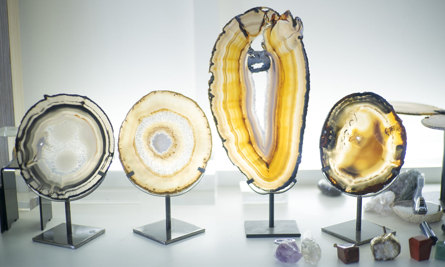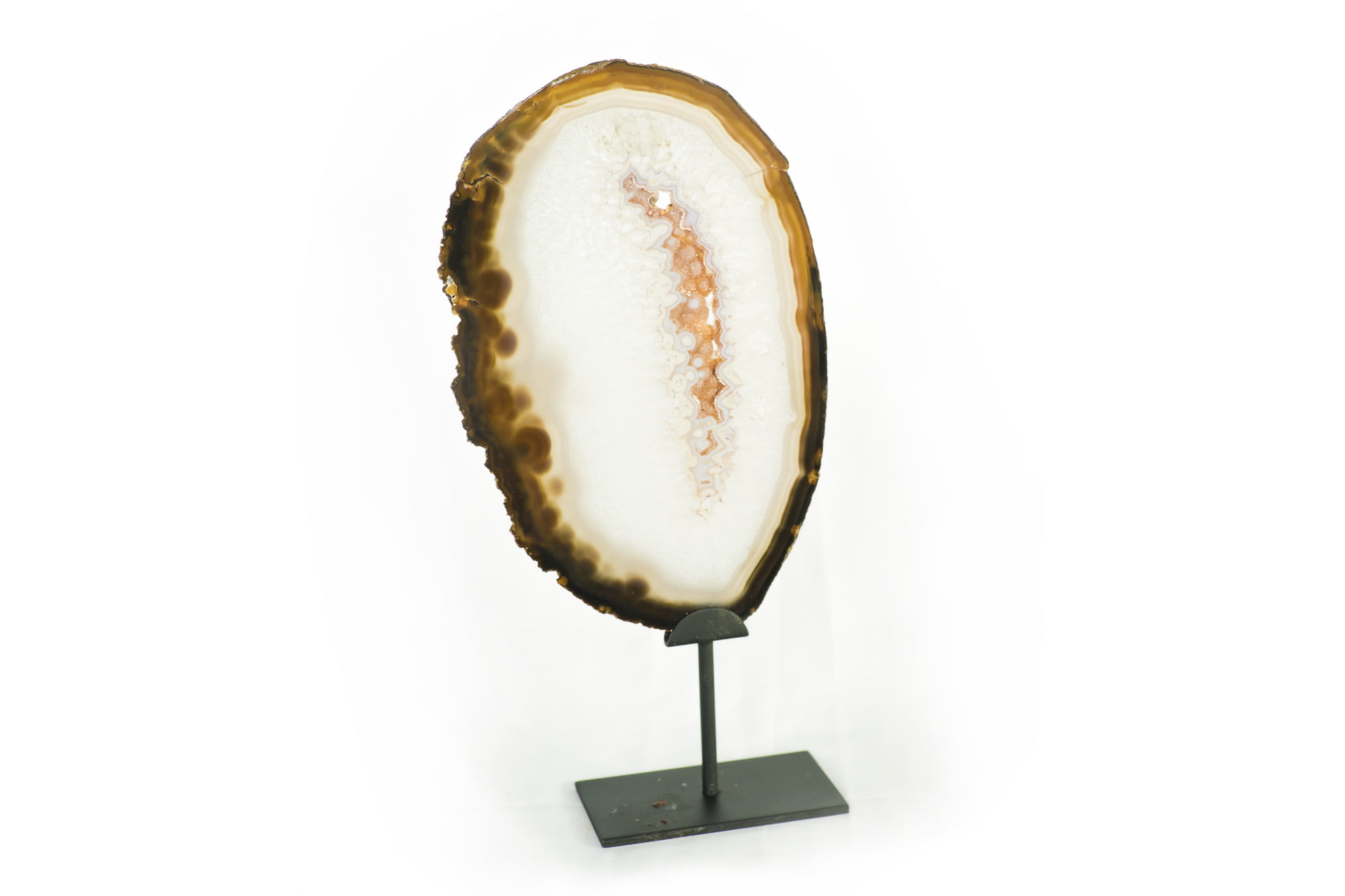 Agate is a rock consisting primarily of cryptocrystalline silica, chiefly chalcedony, alternating with microgranular quartz. Although agates may be found in various kinds of host rock, they are classically associated with volcanic rocks and can be common in certain metamorphic rocks.